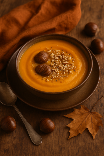 Velouté de potimarron aux châtaignes et éclats de noisettes