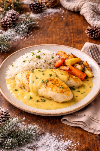 Suprême de volaille à la crème et curry doux, légumes d’hiver